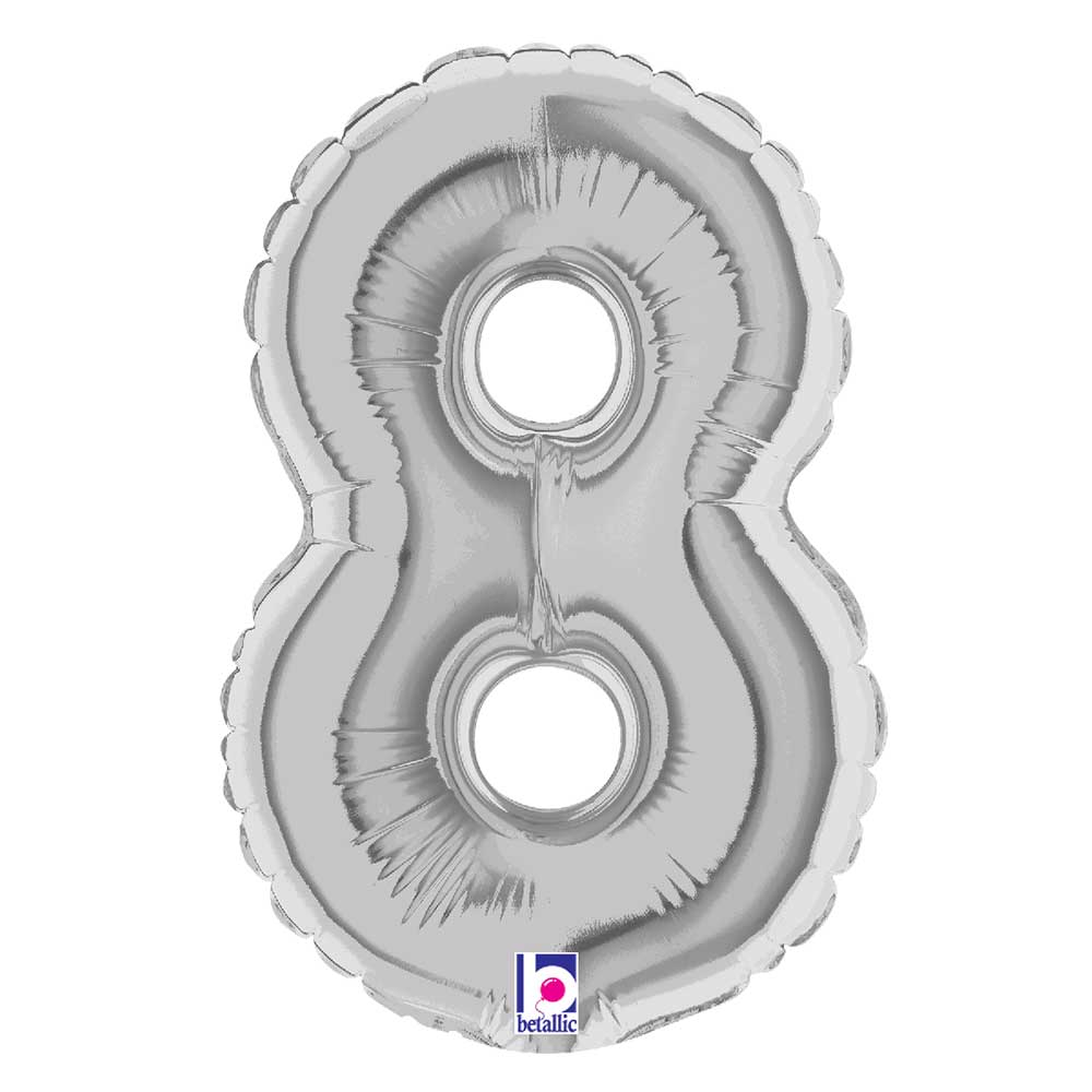 7 inch Betallic Number 8 - Silver Megaloon foil mylar number balloons are the ultimate way to celebrate someone's birthday, a couple’s anniversary, the anniversary of a business and for marketing a special priced product at a business! Inflate balloons with air and attach them to a string to make a celebratory banner or tape them to the wall. Tape and hanging devices not included. Inflate balloons with air-only. Balloon does not float and arrives uninflated.