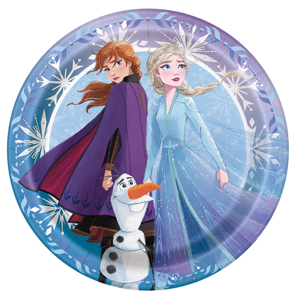 The perfect partyware for your Frozen themed party, these 7" paper dessert plates are great for serving appetizers, small plated food or cake on. Plate features has an image of Elsa, Anna, And Olaf. Includes 8 - 7" Dessert Plates.